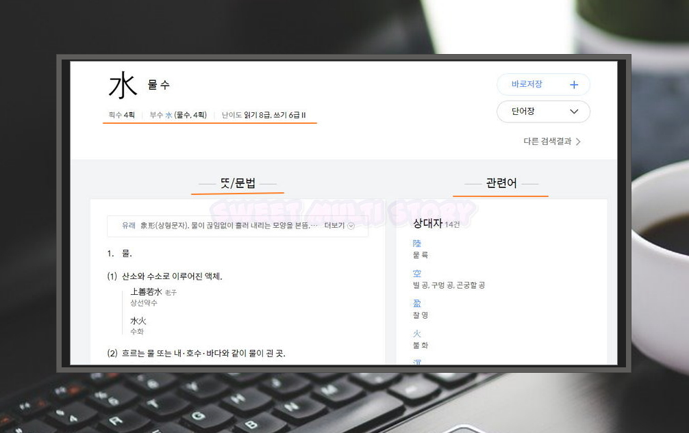 5. 검색 결과를 통해 '물 수'에 대한 음과 한자가 나타났어요. 그 아래에는 해당 한자가 포함된 단어 1000건이 나와요. 해당 문자를 클릭하여 더 자세한 내용을 살펴 볼게요.