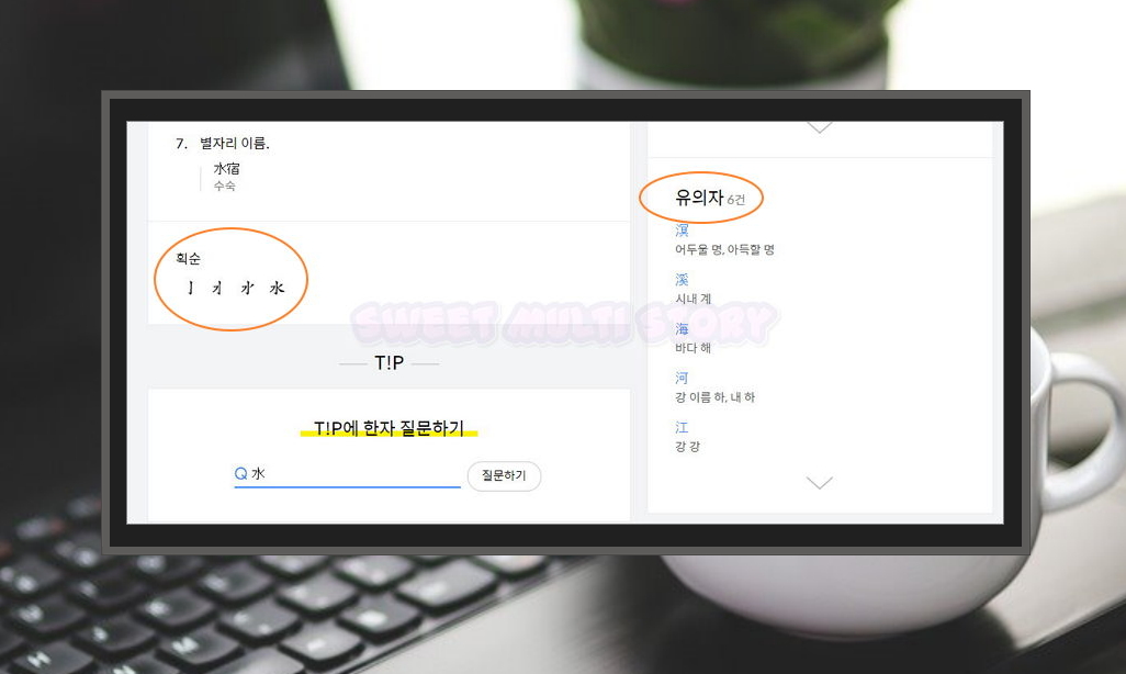 8. 비슷한 의미를 담고 있는 유의자가 6건이 나오는데요. '물 수'의 유의자가 6개나 있는지 처음 알았네요. 마지막으로 획순을 통해 어떤 순서대로 그리면 되는지 알 수 있어요.