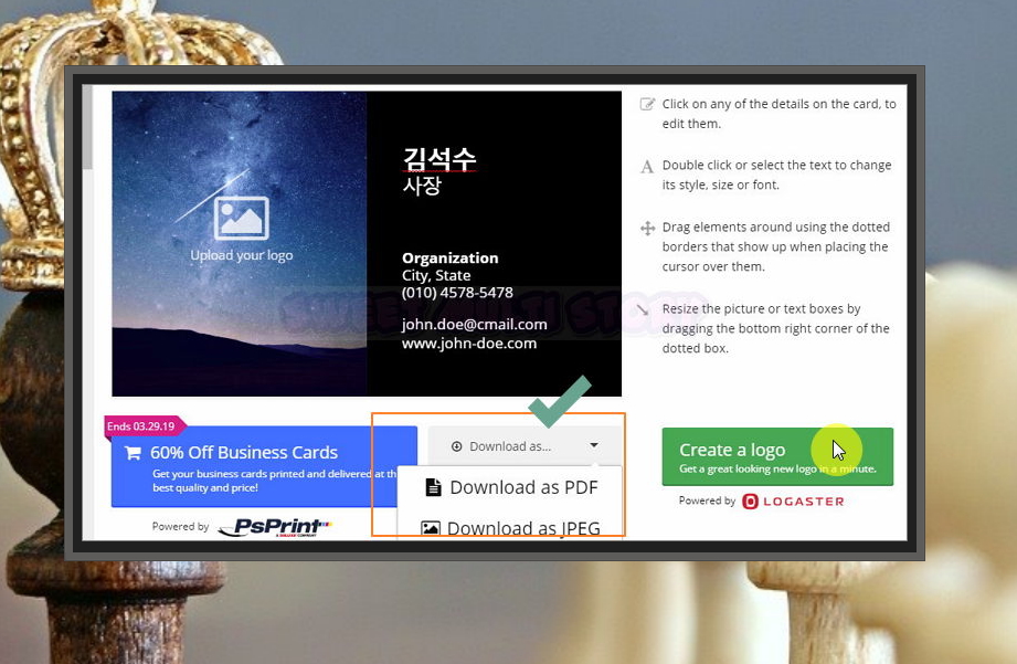 4. 프로그램을 통해 디자인과 내용 꾸밈을 완료했다면 인쇄를 해야 해요. 아래에 있는 [Download as] 버튼을 누르면 PDF 파일이나 이미지 파일인 JPEG 파일로 다운로드 받을 수 있어요. 이와 같은 방식으로 명함의 뒷면도 제작해 보세요.