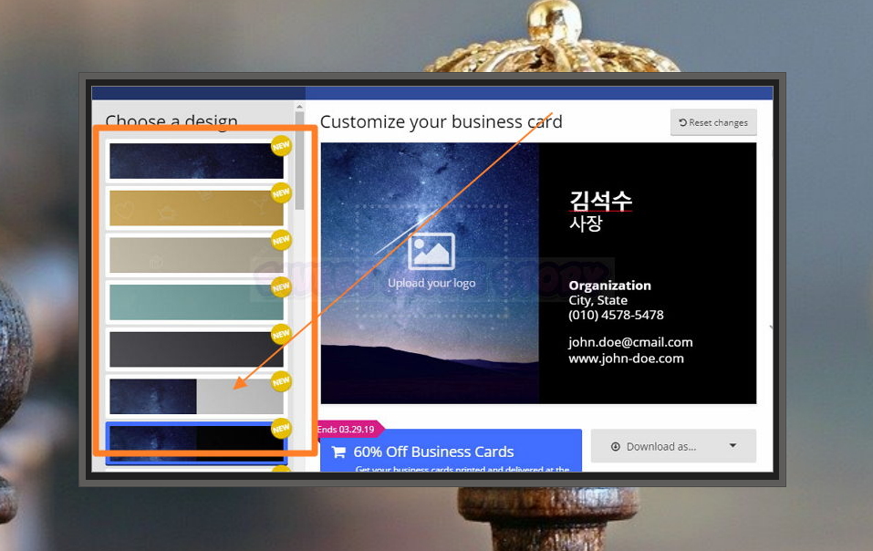 2. 해당 사이트에서 제공하는 명함제작 프로그램을 사용하는 방법을 알려드릴게요. 일단 왼쪽에 있는 [Choose a design]에서 디자인 템플릿을 하나 선택해 주세요. 그럼 [Customize your business card] 부분에 우리가 선택한 명함 디자인이 나타나요.