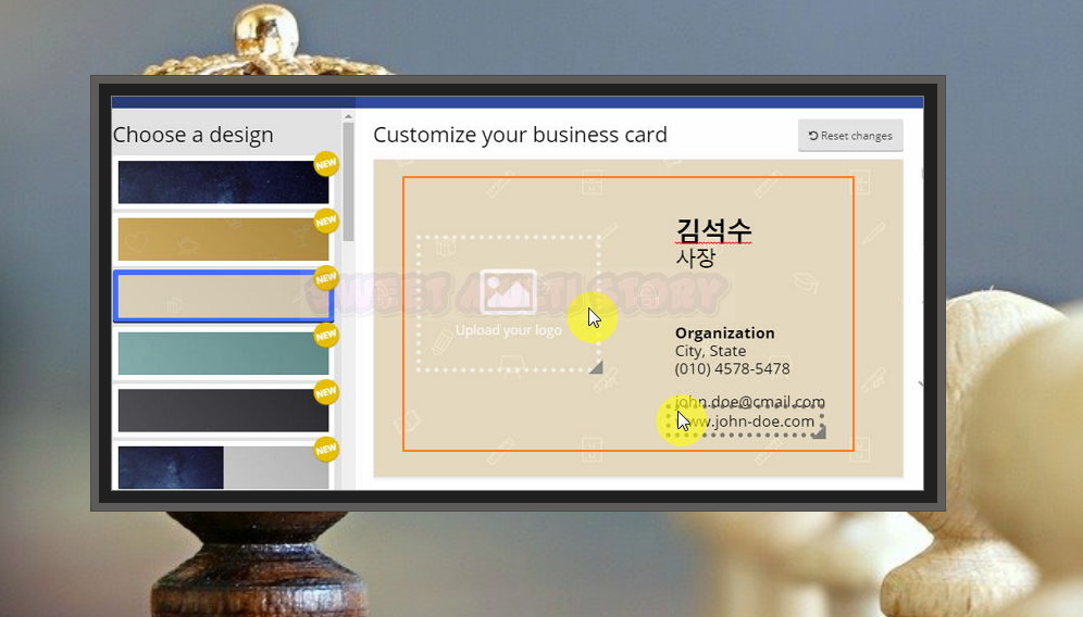 3. [Upload your log]를 클릭하면 회사의 로고를 명함에 넣을 수 있어요. 마우스로 내용을 클릭하면 변경할 수 있고요. 이런 식으로 마음대로 명함제작을 할 수 있는 프로그램이에요.