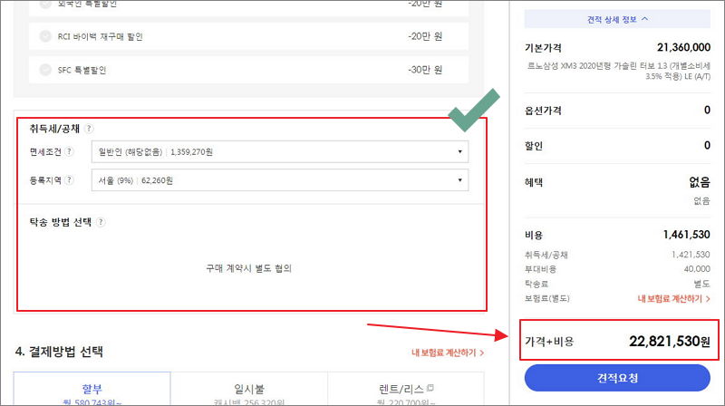 ▼ 마지막으로 취득세와 공채 비용에 영향을 주는 면세조건과 등록지역 그리고 탁송 방법 관련 정보를 입력하면 2단계 가격표를 확인할 수 있습니다. 해당 가격표는 다나와 자동차 사이트 우측에 있습니다. 기본 가격, 옵션 가격, 르노삼성으로부터 받을 수 있는 할인 및 혜택 금액, 추가 비용, 최종 비용을 모두 확인할 수 있는 가격표 입니다.