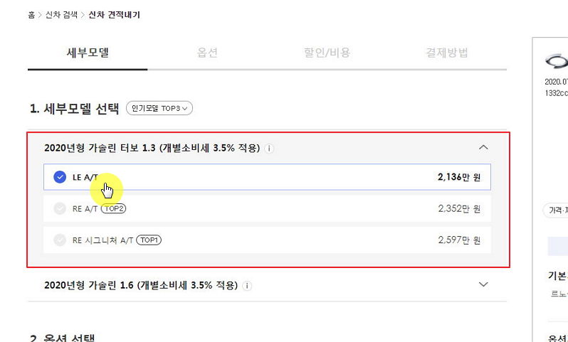 ▼ 몇 가지 조건을 선택해야 르노삼성자동차에 대한 2단계 가격표를 확인할 수 있습니다. 일단 세부 모델입니다. 등급이나 트림이라고도 불리는 것입니다. 세부 모델에 따라 디자인이나 추가할 수 있는 옵션 등이 달라지곤 합니다.