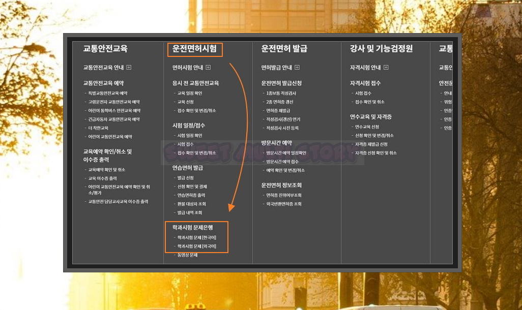 5. [전체메뉴] 버튼을 누르면 여러 카테고리와 서비스 페이지 목록이 나타나요. 운전면허시험 카테고리에서 가장 아랫쪽을 보면 [학과시험 문제은행]이 보이실 거에요. 한국어와 외국어 버전으로 구분이 되어 있는데요. 공부하기에 편한 언어를 선택하시면 돼요.