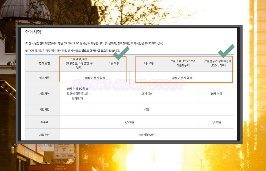 그 밖에도 필기시험에 대해 알아야 할 점이 있어요. 자격, 시간, 수수료, 유형인데요. 일반적으로 많이 취득하는 1종과 2종 보통은 18세 이상이면 자격조건을 충족하고요. 수수료는 7,500원, 주어진 시간은 40분이에요.