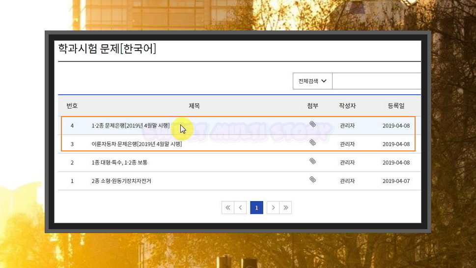 6. 필기시험 문제 페이지에 접속했어요. 4가지 게시물이 나타나는데요. 2019년 4월말로 신청한 경우에는 3번과 4번 게시물을 이용하시면 돼요. 이 후에 지속적으로 업데이트가 되는데요. 자신이 운전면허 필기시험을 치르는 날을 기준으로 그에 맞는 자료를 선택하면 됩니다.