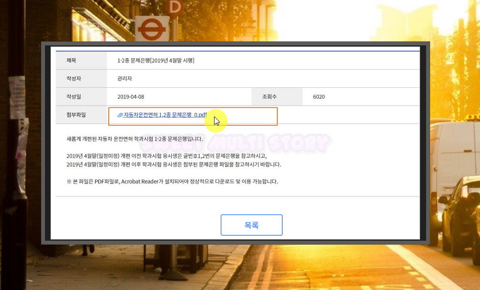 7. 게시물을 클릭해서 보면 이번에 새롭게 개편된 자동차 운전면허 문제은행 자료를 만나볼 수 있어요. pdf 파일로 되어 있기 때문에 pdf 파일을 열 수 있는 전용 뷰어가 필요해요. pdf 전용 뷰어의 경우에는 인터넷에서 검색하면 쉽게 찾을 수 있어요. 대부분 프리웨어로 제공되기 때문에 비용 부담이 없어요.
