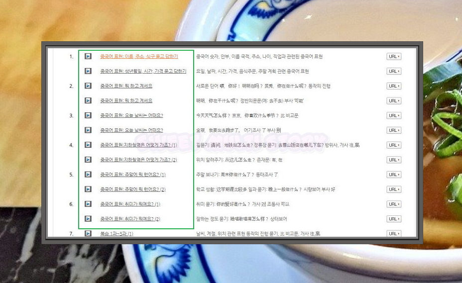 6. 어느 정도 중국어 실력이 있는 분이라면 필요한 부분만 배우는 것도 가능해요. 강좌를 선택하면 회차에 따라 무엇을 배우는지 목록을 볼 수 있는데요. 목록에서 듣고 싶은 부분을 선택하면 해당 부분만 학습 컨텐츠 이용이 가능해요.