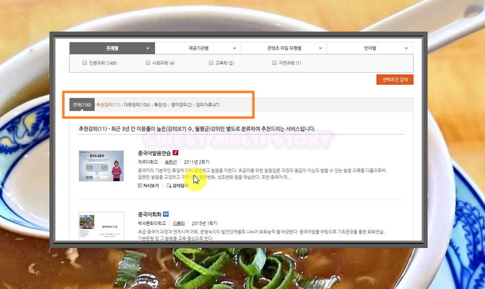 3. 검색을 통해 100여 가지의 중국어 인터넷강의를 찾을 수 있는데요. 성조발음, 기본회화는 물론이고, 비즈니스에 유용한 중국어 강좌도 있어요. 대부분 인터넷 상에서 바로 볼 수 있는 동영상 컨텐츠로 되어 있기 때문에 배우기 좋아요.
