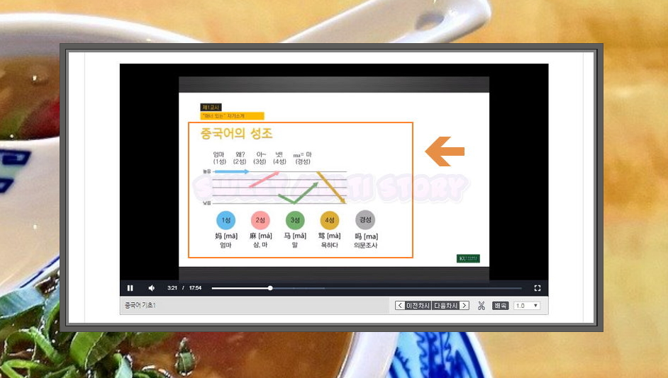 5. 마음에 드는 강좌를 클릭하면 이렇게 동영상으로 볼 수 있어요. 우리나라의 말과 다르게 중국어에는 성조가 있죠. 책으로는 성조를 배우기 어려워요. 이렇게 보고 들으면서 따라 읽을 수 있는 동영상 강의를 이용하는 것이 추천해요. 학원을 다니는 것도 좋고요.