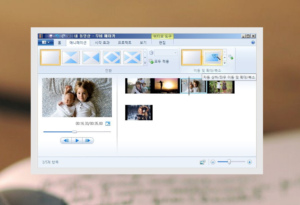 4. 무비 메이커에는 여러가지 애니메이션 효과가 있어요. 기념일 사진에 맞는 효과를 넣으면 되는데요. 저처럼 귀찮은 분들은 '자동 상하/좌우 이동 및 확대/축소'를 이용해 보세요. 그럼 장면마다 다른 효과가 적용돼요.