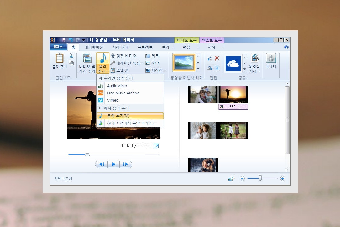 5. 이번에는 배경음악을 넣어볼게요. 기념일 동영상에 들어가는 사진이나 비디오가 중요하지만, 배경음악에 따라 분위기가 확 달라져요. 기념일 동영상 만들기를 할 때 애니메이션 효과 보다 더 음악에 신경 쓰는 것이 좋아요. 사진만 번갈아 나와도 음악만 괜찮다면 멋진 작품이 되거든요. 메뉴에서 홈 탭에 있는 음악 추가 버튼을 이용하면 쉽게 배경음악을 동영상에 입힐 수 있어요.