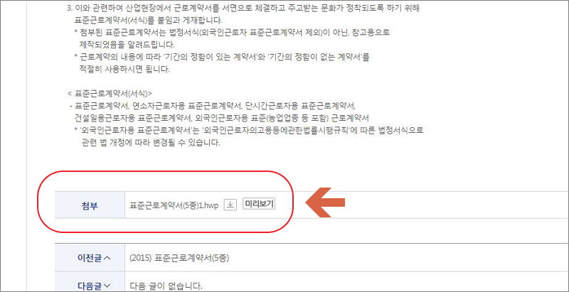▼ 게시물에는 해당 서식에 관련된 정보가 포함되어 있습니다. 게시물 하단을 보면 파일 하나가 첨부되어 있습니다. 표준근로계약서 5종이라는 이름을 가진 hwp 파일입니다. 해당 파일 옆에 있는 다운로드 버튼을 클릭하면 해당 문서를 컴퓨터에 내려 받을 수 있습니다.
