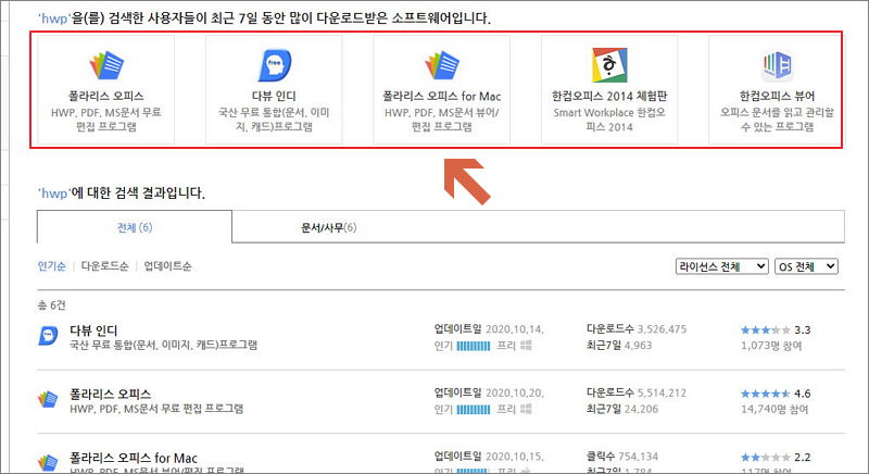 ▼ 네이버 소프트웨어 사이트에서 hwp을 검색합니다. 그럼 폴라리스 오피스, 다뷰 인디, 한컴오피스 체험판 등이 나타납니다. 해당 프로그램을 이용하면 고용노동부에서 다운 받은 표준근로계약서 양식 파일을 열 수 있습니다.