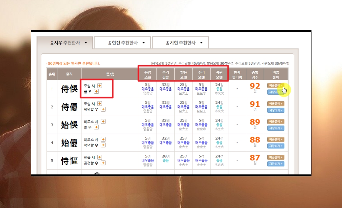 우리가 선택한 성명에 대한 추천 한자를 확인할 수 있는데요.