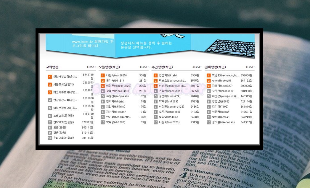 이제는 인터넷 세상입니다. 굳이 성경책을 사거나 펴지 않아도 인터넷을 통해 성경 내용을 읽거나 타이핑을 할 수 있는데요. 오랜 기간이 걸리는 통독은 'KCM 성경 타자'를 이용하는 것이 좋습니다. 인터넷 주소를 통해 접속해주세요.