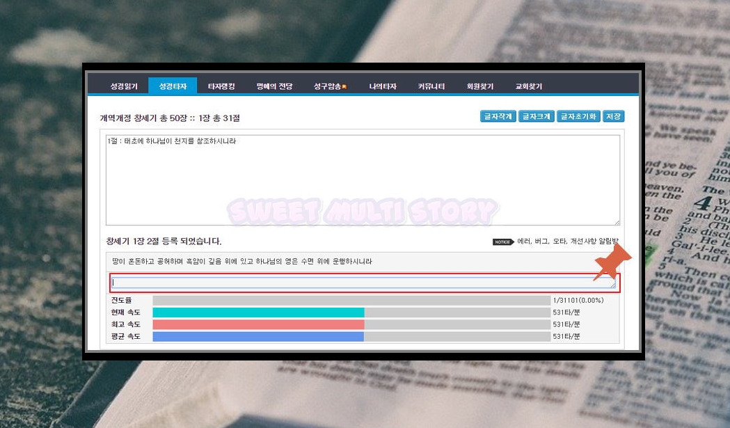 성경 내용이 나오면 똑같이 작성하시면 됩니다. 그럼 진도율, 현재속도, 최고속도, 평균속도와 같은 통계지표가 나오기 때문에 통독이 되면서 타자연습도 같이 할 수 있어요.