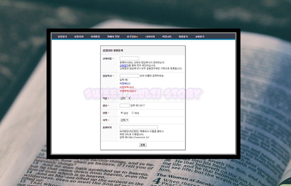 등록에 필요한 내용은 교회이름, 담임목사, 직분, 생년, 성별, 지역 등입니다. 처음에만 등록하면 성경타자 통독 서비스를 계속 이용하실 수 있어요.