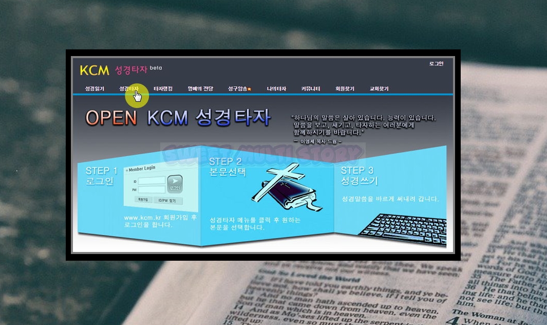 이제는 인터넷 세상입니다. 굳이 성경책을 사거나 펴지 않아도 인터넷을 통해 성경 내용을 읽거나 타이핑을 할 수 있는데요. 오랜 기간이 걸리는 통독은 'KCM 성경 타자'를 이용하는 것이 좋습니다. 인터넷 주소를 통해 접속해주세요.