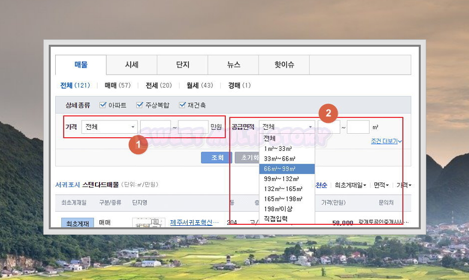 제주도 부동산을 알아보기 이넞에 본인이 원하는 조건을 정해놓으시는 것이 좋습니다. 가격과 공급면접의 크기인데요. 미리 설정하실 수 있습니다. 아파트의 경우 매물이 일반 아파트인지, 주상복합 또는 재건축인지 정해놓을 수 있어요.