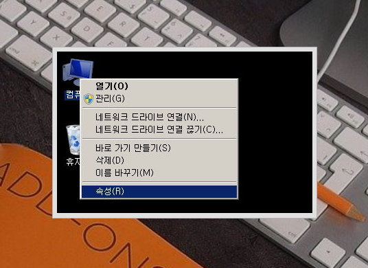 ▲ 윈도우 바탕화면에 있는 '내 컴퓨터'에 대고 오른쪽 마우스(속성)를 클릭한다.