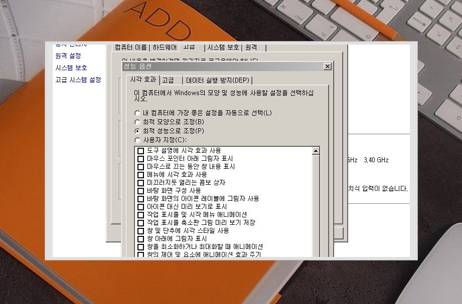 이렇게만 하시면 간단하게 데스크톱 창 관리자의 점유율을 낮출 수 있습니다. 대신 윈도우 시각 효과가 다소 떨어지는 것을 느끼실 수도 있는데 이것이 많이 거슬리신다면 '최적 성능으로 조정' 대신에 '사용자 지정'을 선택 후 원하는 효과들만을 선택하여 사용하는 방법도 있습니다.