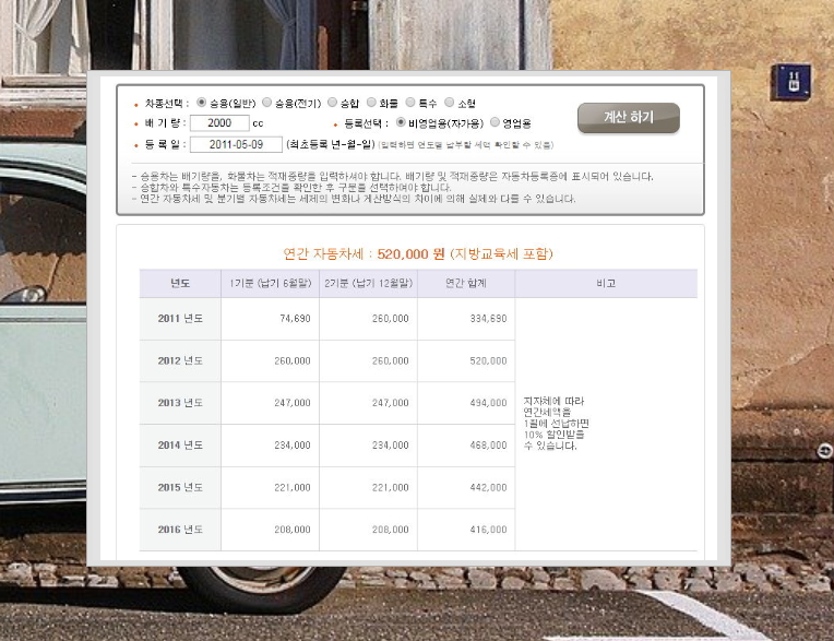 결과를 보시면 아시겠지만, 지방교육세 포함한 연간 자동차세를 확인하실 수 있어요.