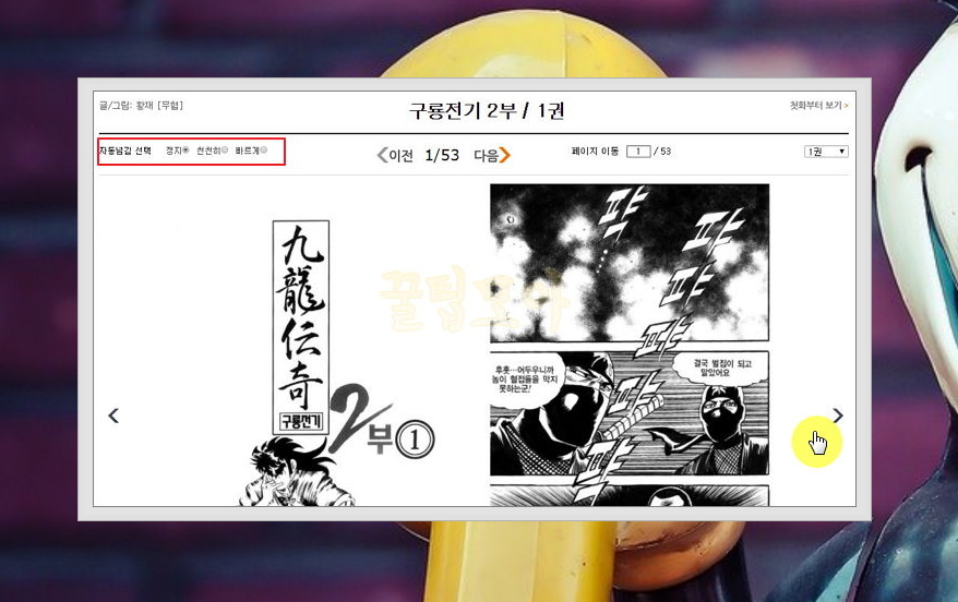 5) 감상하길 원하는 작품을 클릭하면 바로 볼 수 있는데요. 무료만화를 볼 때 사용법을 간단하게 설명 드리겠습니다. 다음 장으로 넘기려면 오른쪽 화면을 클릭하면 되고요. 일일이 넘기기 귀찮으면 스포츠서울의 자동넘김 선택 기능을 이용하여 손대지 않고 페이지를 넘길 수 있습니다.
