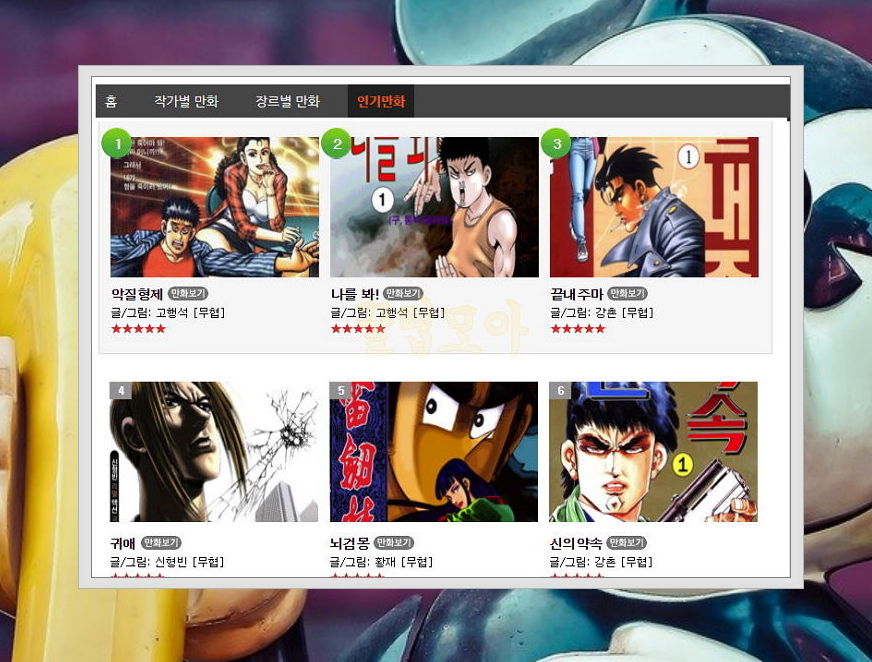 7) 장르에 따라 무협, 액션, 극화, 스포츠, 웹툰으로 나뉘고 있으니 마음에 드는 무료만화를 찾아보세요.