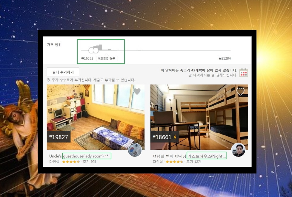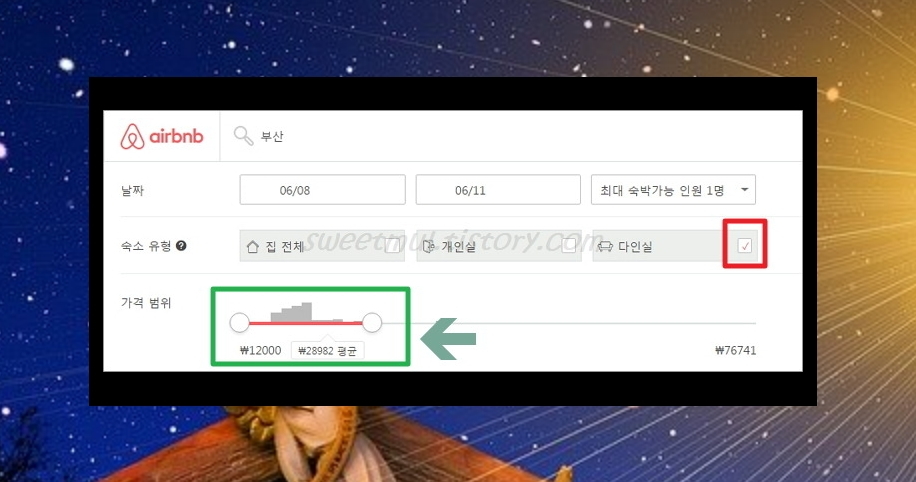 가격범위에서는 자신이 지불할 수 있는 가격을 설정하는 건데요. 부산게스트하우스 가격의 평균값을 바로 확인하실 수 있답니다. 평균 가격은 28982원인데요. 그래프(빈도수)를 보시면 긴막대기가 4개있는데, 앞의 2개가 16000~21000원 구간입니다. 이 구간만해도 물량이 많으니까 여기를 타겟으로 하면 되겠네요.^^