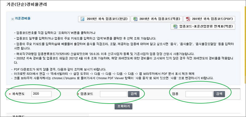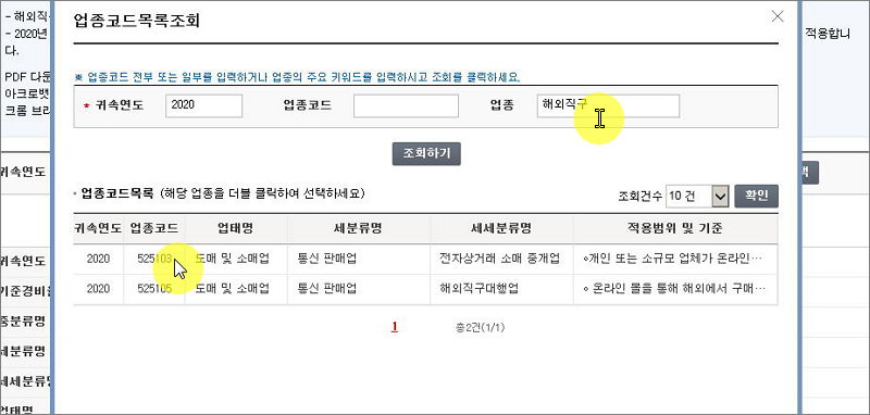 ▼ 귀속연도에 따라 업종코드가 달라질 수 있습니다. 해외직구대행업과 같이 신설된 코드도 있습니다. 귀속연도와 업종 또는 코드를 입력한 후 검색 버튼을 클릭합니다.