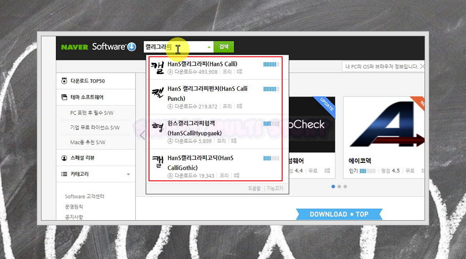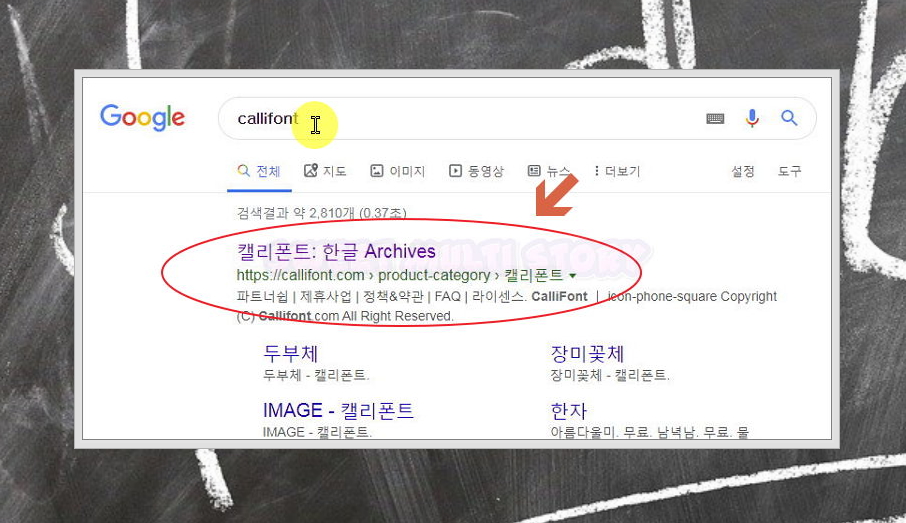 2. 검색창에 캘리그라피를 입력해 보세요. 그럼 다운 받을 수 있는 캘리그라피 폰트를 찾을 수 있어요.