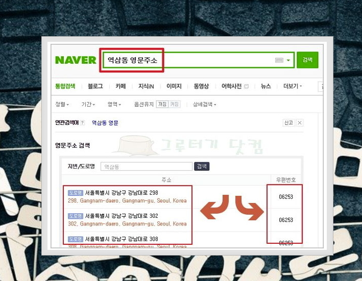 알고 싶은 주소 뒤에 "영문주소"라고 치고 검색을 해주세요. 간단하게 영문으로된 주소와 우편번호를 알 수 있답니다.