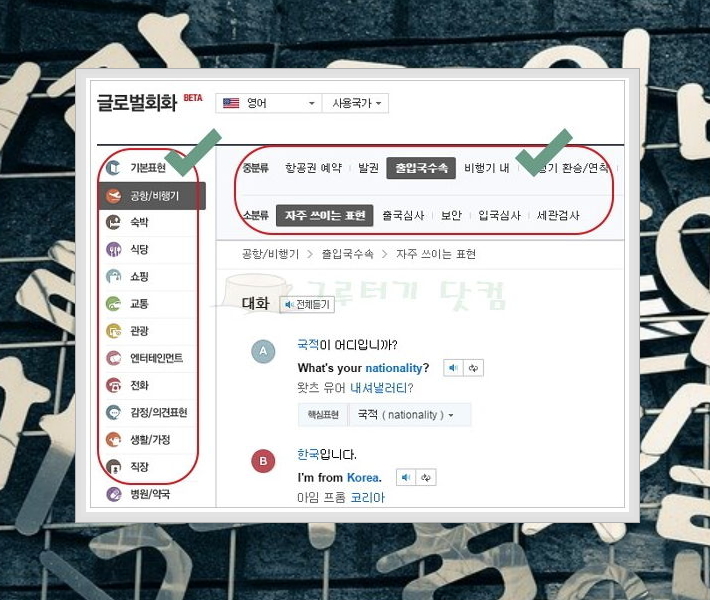 최근에 만들어진 사이트인 '네이버 글로벌회화'인데요. 사용하기 매우 편리합니다. 간단한 영어회화를 하고 싶거나 갑작스런 상황일 때 사용하시면 좋은데요. 어플로도 있으니 이용해보세요.