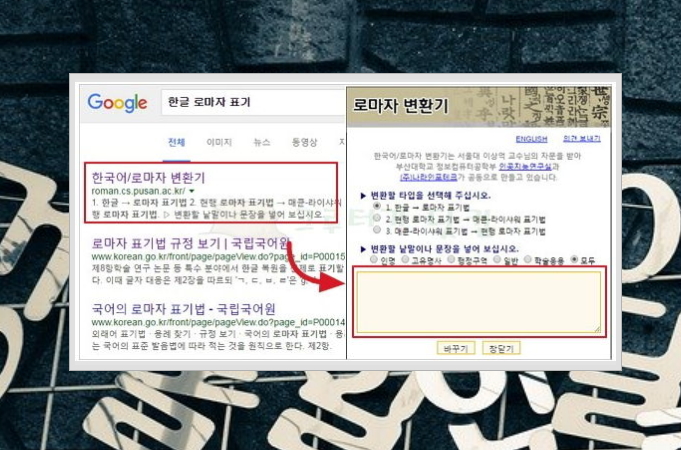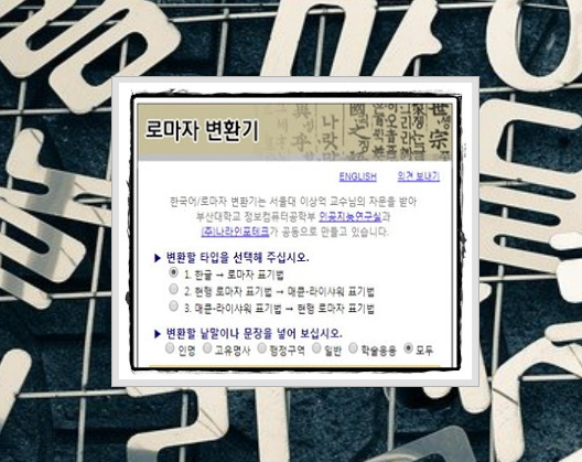 구글에서 검색하면 쉽게 접속하실 수 있는데요. 인명 / 고유명사 / 행정구역 / 일반 / 학술응용의 한글낱말이나 문장을 간단하게 영어로 바꿔준답니다.