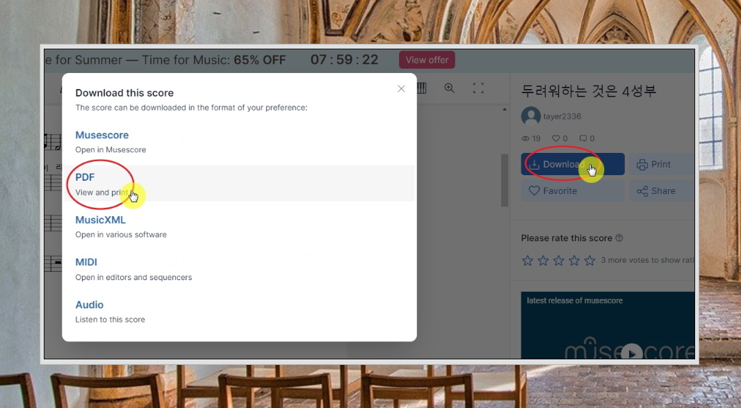 6. 악보를 다운로드 받으려면 사이트 화면 우측에 있는 [Download] 버튼을 클릭하면 됩니다. 그럼 새로운 창이 열리는데, 5가지 방식으로 자료를 내려 받을 수 있습니다. 여기에서 PDF 파일을 선택하면 되는데요. MIDI나 Audio를 선택하면 음악 파일을 다운로드 받을 수 있습니다.