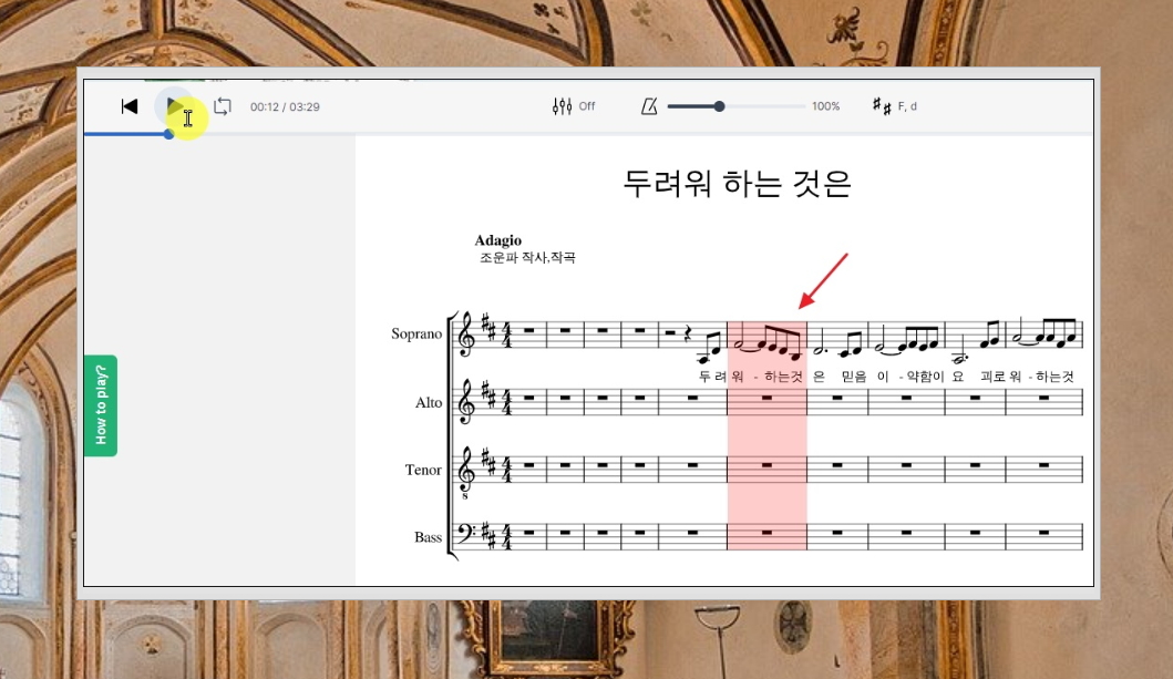 5. 이번에는 "두려워 하는 것은"이라는 곡을 선택했습니다. 좌측 상단에 보면 재생 버튼이 있는데요. 해당 버튼을 누르면 해당 곡에 대한 연주 음악을 들어볼 수 있습니다. 화면 상단에 여러 가지 기능이 많이 있으니 필요하신 분들은 이용해 보시길 바랍니다.