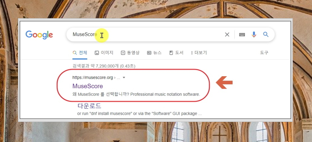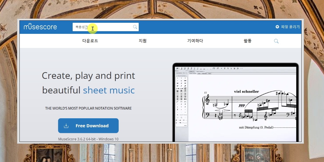 2. 그럼 본격적으로 복음성가 악보 모음을 다운 받는 방법을 알려드리겠습니다. 해외 사이트를 이용해 보려고 하는데요. 한글화가 잘 되어 있기 때문에 영어를 잘 못해도 쉽게 이용이 가능한 곳입니다. 무료 악보가 많은 MuseScore 사이트에 접속해서 어떻게 복음성가 관련 자료를 다운로드 받는지 알려드릴게요.