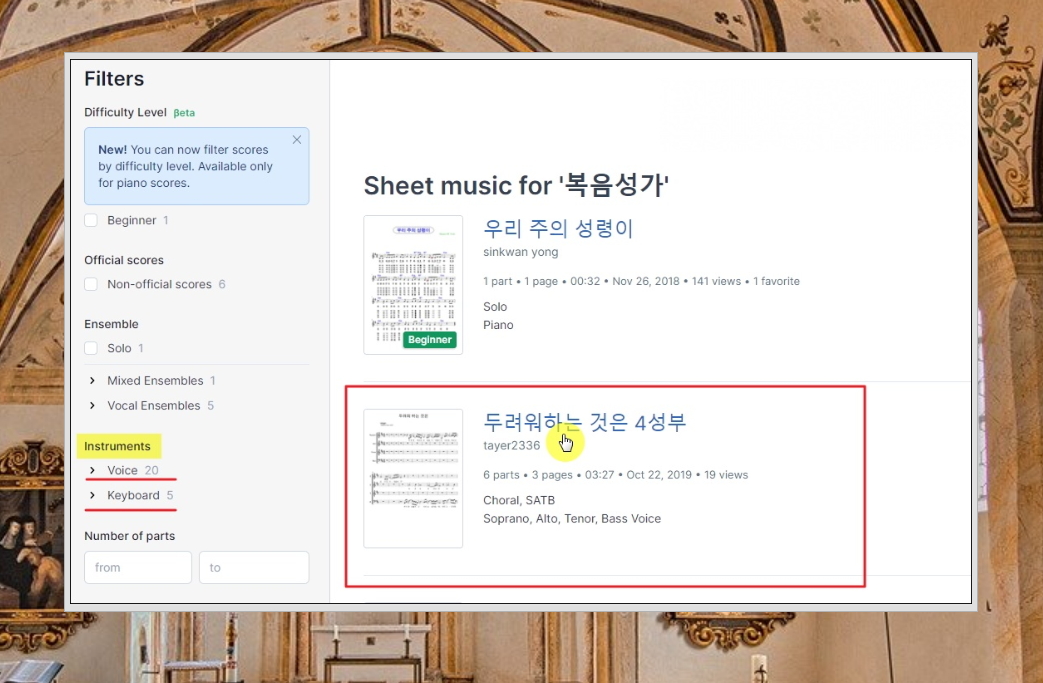 4. 검색 결과가 나왔습니다. 여러 개의 복음성가 악보가 나타났는데요. 좌측에 있는 필터를 통해 원하는 형식의 자료만 골라낼 수 있습니다. Instruments는 연주하는 악기를 의미하는데요. 육성으로 노래 부를 때 사용하는 악보는 20개와 키보드 연주용이 5개가 있다고 합니다. 그럼 마음에 드는 곡을 선택해 보세요.