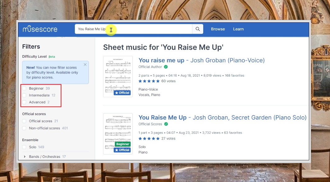 7. 좀 더 많은 복음성가 악보를 검색하는 방법을 알려드리겠습니다. 원하는 복음성가 곡이 있으면 해당 곡의 영문명을 찾습니다. 그다음 영문명을 가지고 MuseScore 사이트에서 검색하면 됩니다. 아무래도 해외 사이트이기 때문에 영어으로 된 자료가 많습니다. 일부 유료 서비스도 있지만, 상당 부분 무료로 사용할 수 있으니 참고하시길 바랍니다. 그리고 필터에서 보면 연주 난이도가 있는데요. 이렇게 난이도에 따라 자신에게 맞는 자료를 선택할 수도 있습니다.