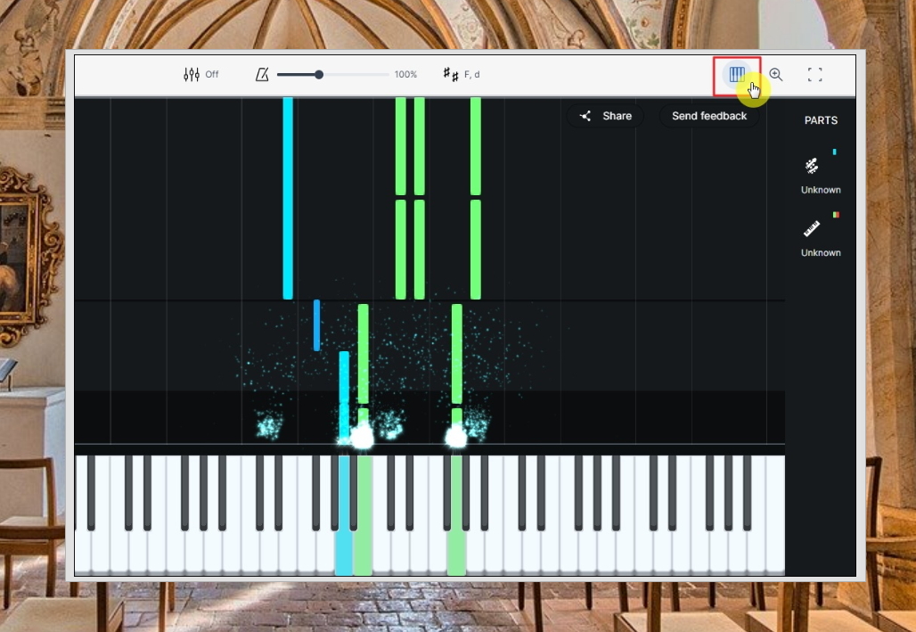 9. 메뉴에서 "피아노 모양"의 아이콘을 클릭해 보세요. 그럼 다음과 같이 화면에 피아노 건반이 나타나면서 연주하는 모습을 영상으로 보여줍니다. 뭔가 게임 화면을 보는 것 같은데요. 연주하는 사람에게 도움이 되는 기능이라고 생각됩니다..