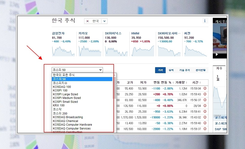 3. 국내 주식도 여러 가지로 나뉠 수 있습니다. 리스트 좌측 상단을 클릭해 보면 코스피, 코스닥 등 여러 가지 선택이 가능합니다. 해당 지수에 포함된 종목을 나오게 할 수 있습니다. 사이트에서 "한국의 모든 주식"을 클릭하면 전 종목 보기가 가능하죠.