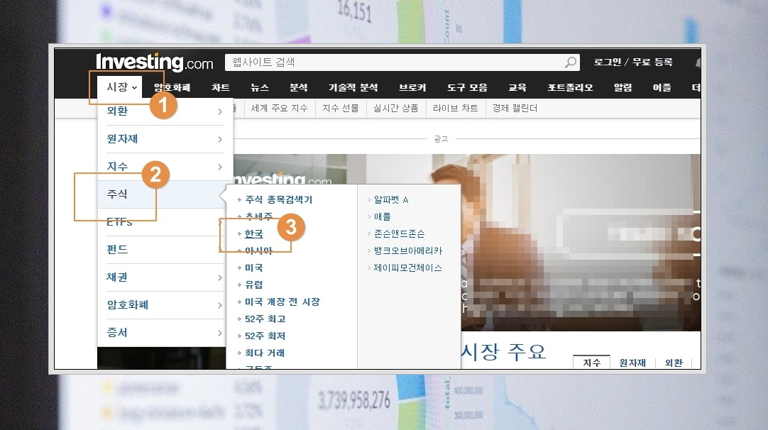 2. 인베스팅 사이트에 접속했습니다. 메뉴가 너무 많아서 처음에 접속하면 복잡해 보일 수 있는데요. 가장 첫 번째 메뉴인 "시장"을 클릭해 보세요. 그럼 다양한 투자 상품이 나옵니다. 여기에서 주식을 선택한 후 관심 있는 영역을 선택하면 돼요. 국내 주식 종목에 대한 차트를 보고 싶다면 "한국"을 선택하면 됩니다.