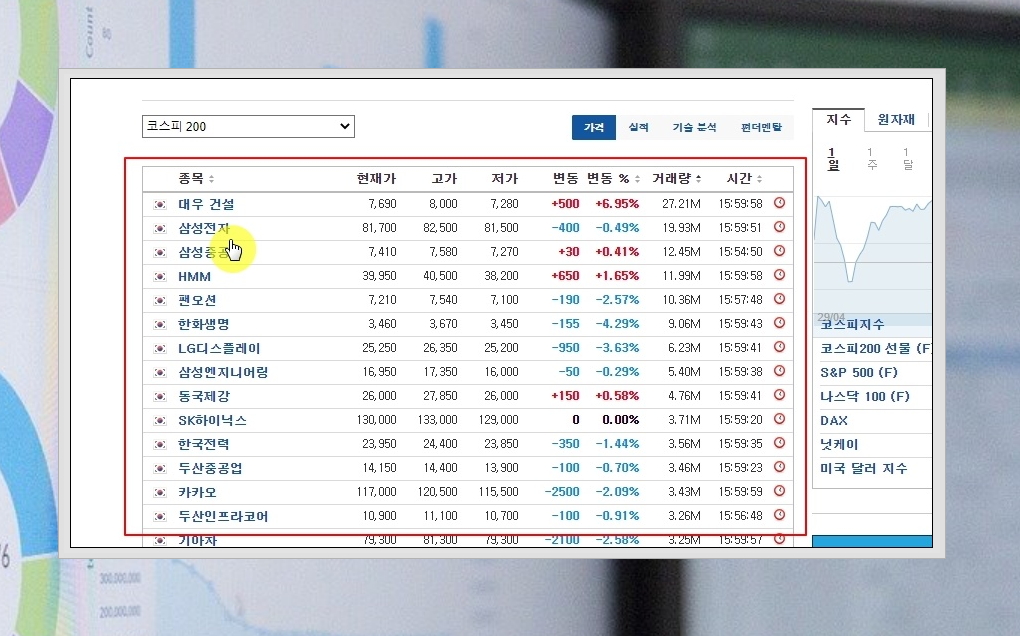 4. 저는 우량주가 많은 코스피 200을 선택했습니다. 대우 건설, 삼성전자, 삼성증권, HMM 등 여러 가지 종목이 보이는데요. 여기에서 실시간으로 살펴 보고 싶은 종목을 클릭해 주세요.