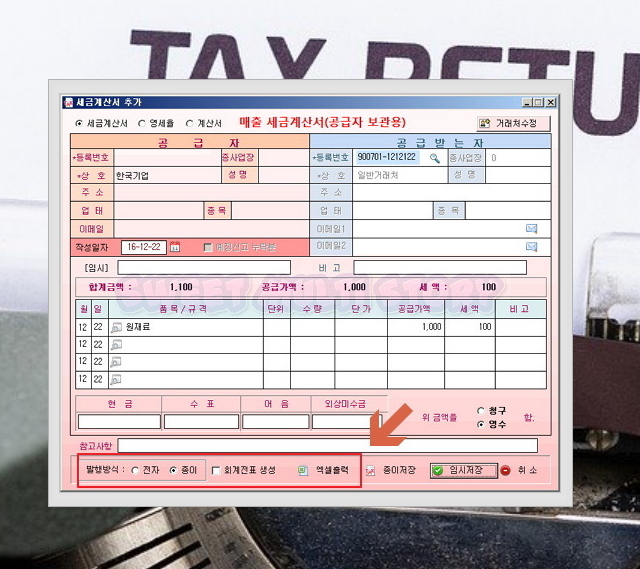 이전 단계에서 계산서버튼을 눌렀다면 위와 같은 창이 나오는데요. 종이를 선택한 후 엑셀출력을 누르면 좀 전에 다운로드를 한 양식과 똑같은 종이세금계산서를 얻을 수 있답니다. 전자를 누르면 전자발행할 수 있답니다.