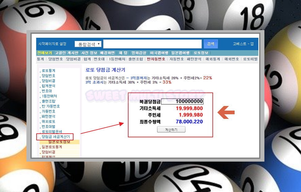 메뉴에서 '당첨금 세금계산기'를 클릭하면 로또 전용 계산기가 나타나는데요. 본인이 당첨된 금액을 맨 위 칸에 넣으면 기타소득세와 주민세, 최종수령액까지 모두 알려준답니다. 1억원이 당첨되었을 때에는 7천800만원을 받을 수 있네요.