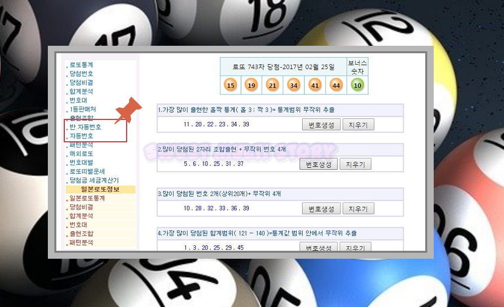 왼쪽에 보시면 유용하게 사용할 수 있는 서비스가 많은데요. 이 중에서 제가 가장 좋아하는 것은 '자동추첨기'입니다. 클릭하면 자동으로 번호를 추천해주는데요. 정말 쉽습니다. 반자동추첨기를 사용하면 추첨은 되었으나 마음에 드는 번호를 뽑을 수 있습니다.