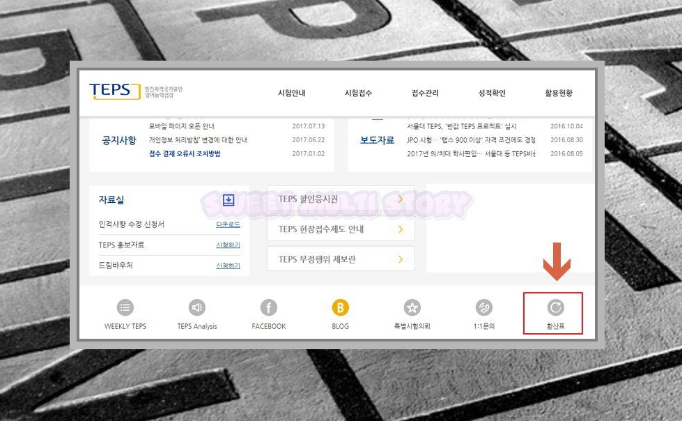 텝스 홈페이지에 접속하면 시험안내, 시험접수, 성적확인 등 다양한 메뉴가 나오는데요. 아무리 봐도 OPIc 환산표를 찾을 수 없습니다. 해답을 드릴게요. 화면을 맨 아래로 내려보세요. 그럼 등급에 따른 점수를 확인할 수 있는 환산표 버튼이 있습니다.