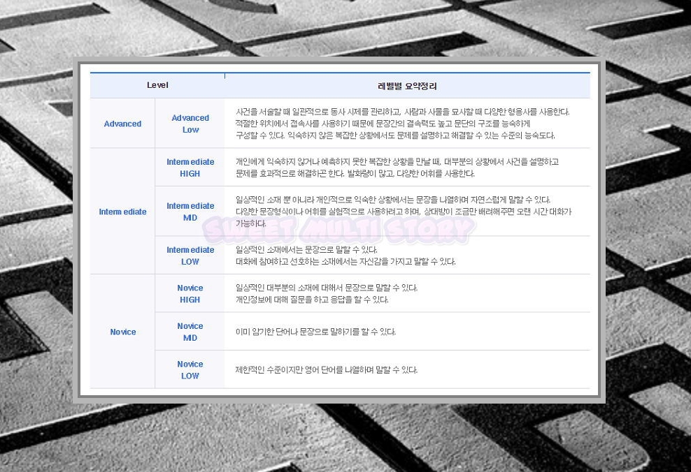 OPIc 홈페이지의 등급체계 페이지를 보면 각 등급의 의미에 대하여 명확하게 나와 있는데요. 높은 점수를 받으려면 어휘를 많이 알고, 본인이 하고자 하는 이야기를 제대로 할 줄 알아야 합니다. 여기에 더하여 영어로 문제를 해결할 수 있을 정도면 최고 점수를 받을 수 있죠.