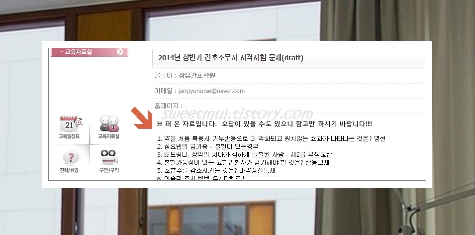 제가 찾은 학원사이트에서는 학원 수강을 하지 않아도 간호조무사 기출문제 및 요점정리를 볼 수 있답니다. 교육안내 메뉴에서 가장 오른쪽에 교육자료실 있습니다. 클릭해주세요.